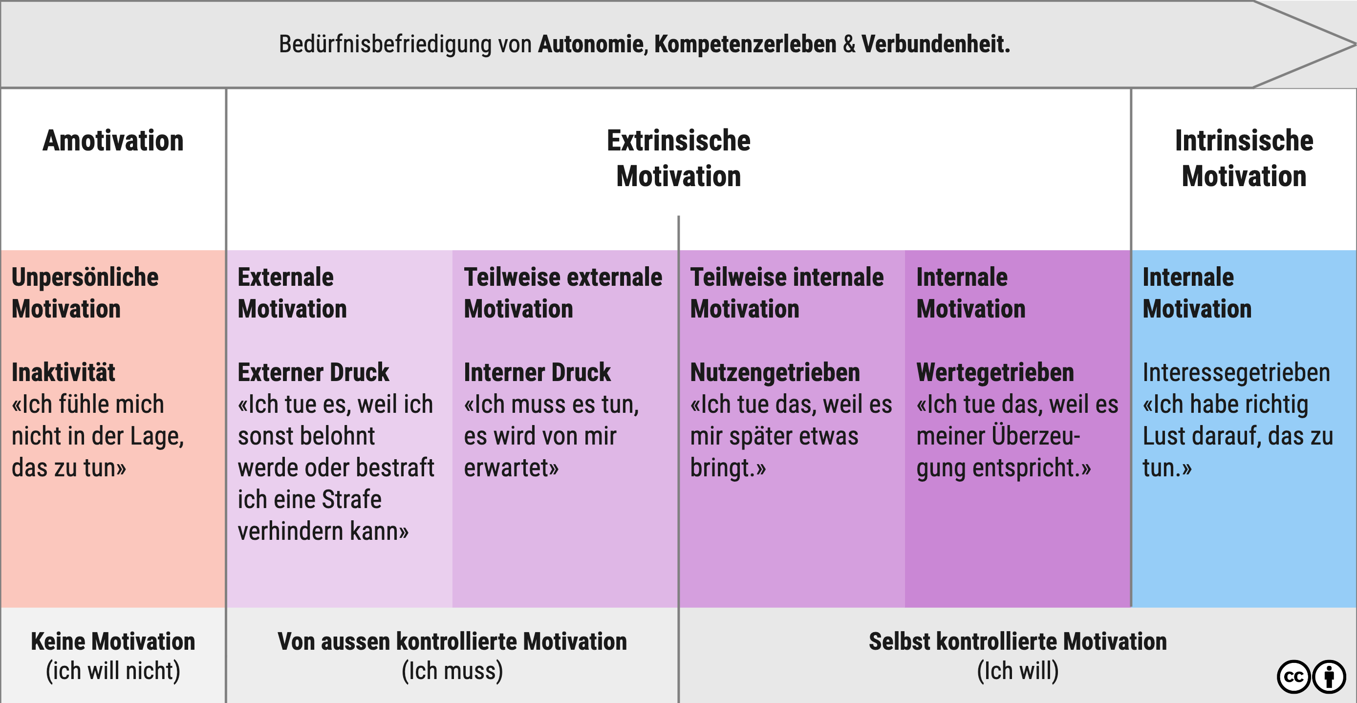 - Reflexion von Belohnungssystemen: Zu starke Fokussierung auf Noten und Belohnungen kann die intrinsische Motivation hemmen. Stattdessen sollte das eigentliche Lernen und der Prozess in den Vordergrund gestellt werden. Die grosse Gefahr besteht darin, dass Noten und die Vermeidung von „Einträgen“ (schriftlicher Vermerk eines Verstosses) zu extrinsischer Motivation führen. Dies ist spürbar, wenn die Schülerinnen und Schüler immer weniger Motivation und Freude am Lernen zeigen. Dann braucht es eine Anpassung der Lernumgebung an die drei Grundbedürfnisse Autonomie, Kompetenzerleben und Verbundenheit.